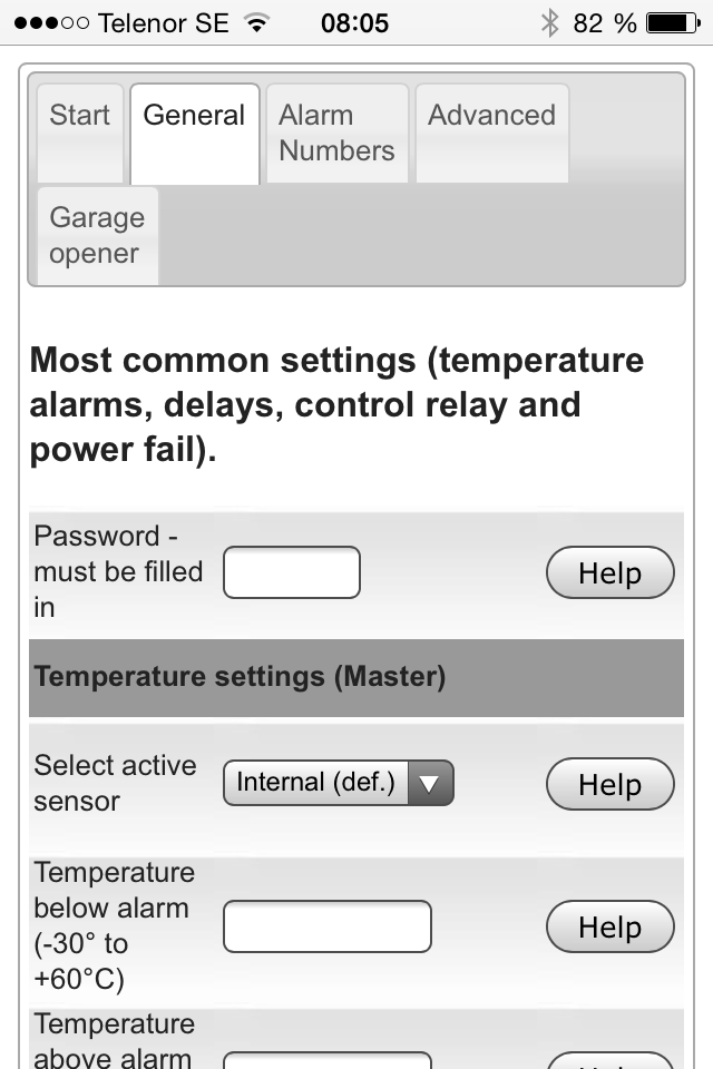 Programming of functions and alarm lists is easily made with the app. A code will be generated and sent to the unit which will save this code in its memory and restart the unit to start up with the new settings. Even if the power should disappear and the back- up battery should run out of power, the settings will still be remembered.