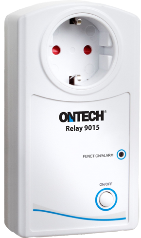 The Ontech Relay 9015 is an extra relay that wirelessly communicates with the main unit. It is also knows as a slave unit. The unit has a controllable 230V socket and two alarm inputs for wired alarm sensors.